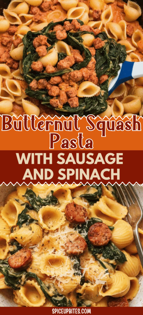 You’ve got creamy, roasted squash sauce, juicy bits of sausage, and fresh spinach folded in at the end — all tossed with tender pasta. It’s rich, cozy, and surprisingly simple to pull together on a weeknight.