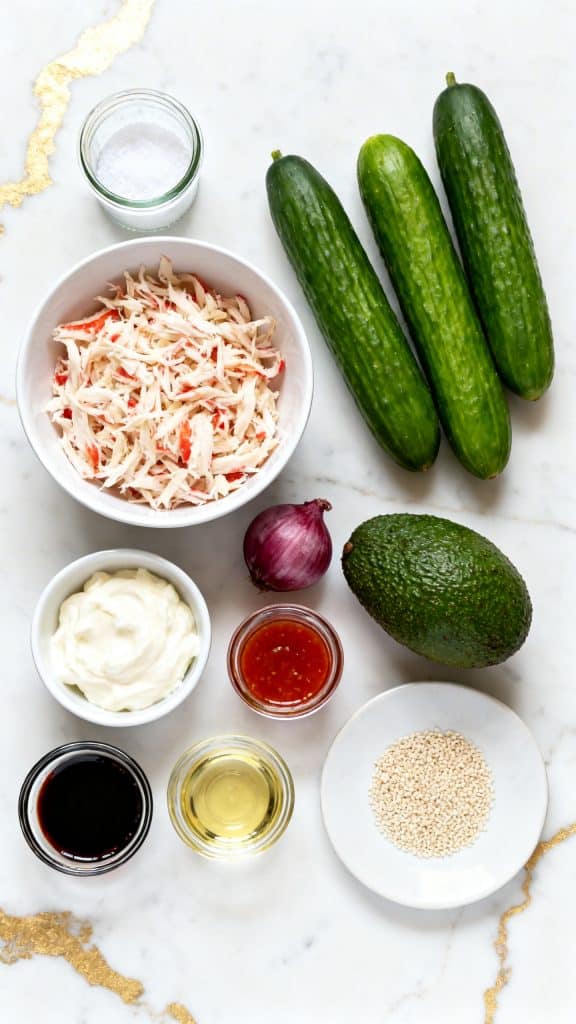 Salt pulls water out of cucumbers through osmosis. That keeps the salad crisp instead of soggy. The fat from the mayo and avocado helps carry flavor, so every bite tastes rich. The vinegar and soy sauce add acid and salt, which balance the creaminess and make the flavors pop.