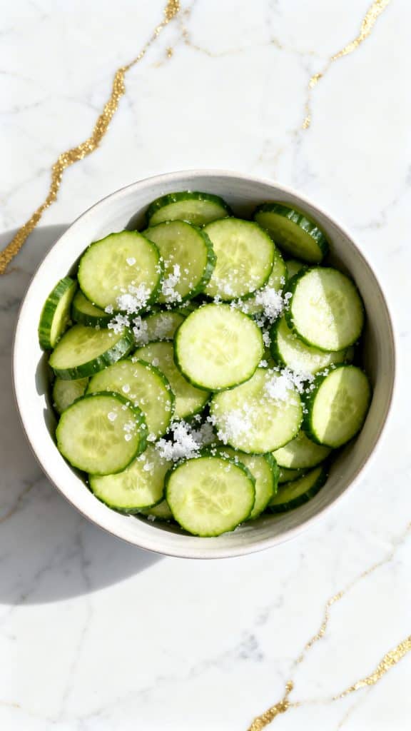 Thinly slice 3 medium cucumbers into rounds. Place them in a colander and sprinkle with 1 teaspoon salt. Toss and let them sit for 10 minutes to draw out extra water. After 10 minutes, gently squeeze out the liquid.