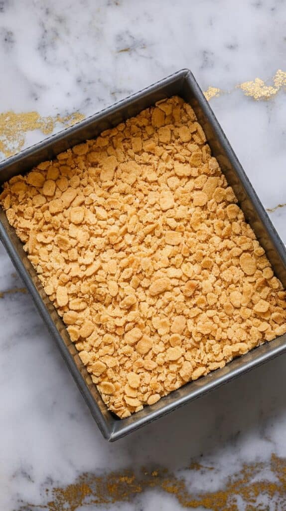 Mix 2 cups graham cracker crumbs, 1/2 cup melted unsalted butter, and 1/4 cup granulated sugar in a bowl. Press the mixture into the bottom of a parchment-lined 9×9 baking pan. Bake at 350°F (175°C) for 10 minutes.