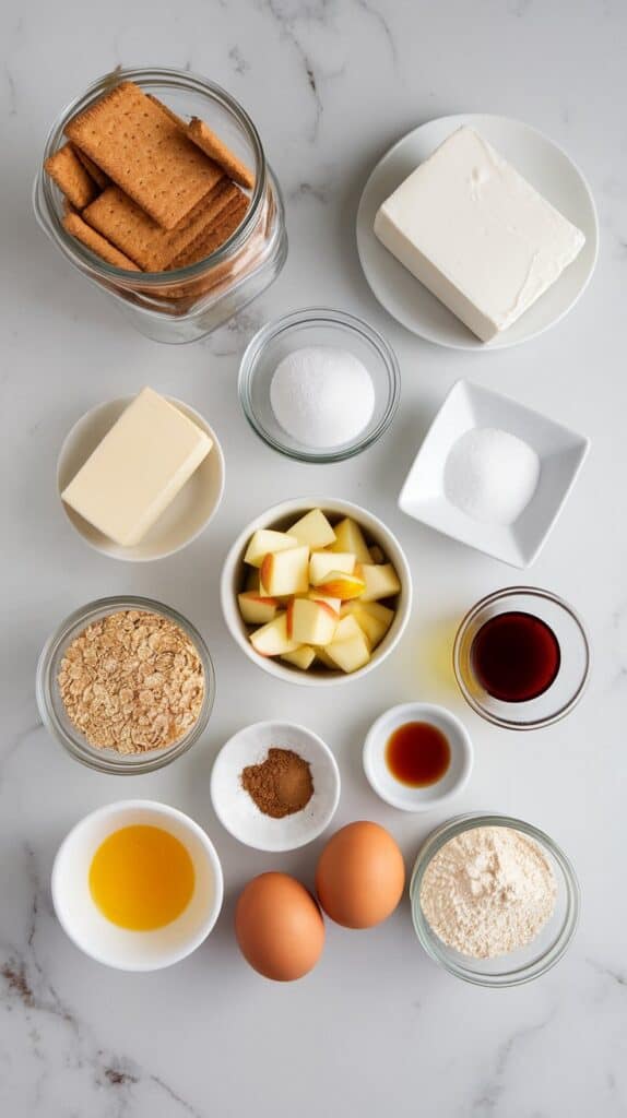 The graham cracker crust acts as a moisture barrier, keeping the base crisp. The cheesecake layer is stabilized by eggs, which firm up during baking without needing a water bath. Apples release a little juice as they bake, which seeps into the cheesecake just enough to flavor it without making it soggy. The streusel on top adds texture and locks in moisture.