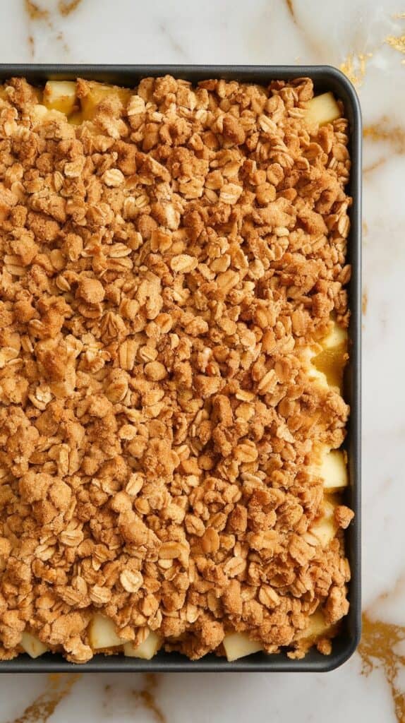 In another bowl, mix 1/2 cup oats, 1/3 cup flour, 1/3 cup brown sugar, 1/2 tsp cinnamon, and 1/4 cup softened butter with a fork until crumbly. Sprinkle this over the apples.
