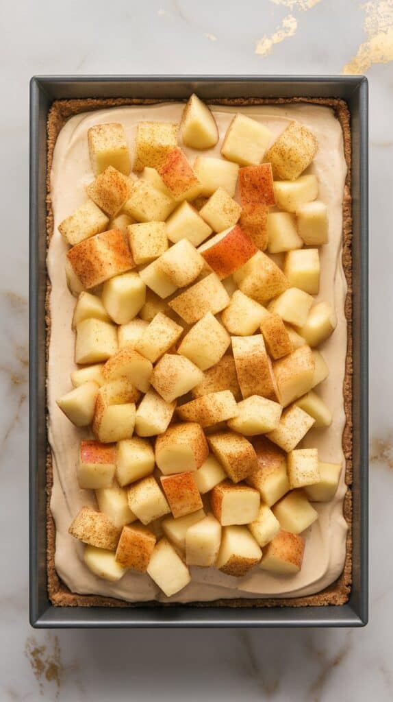 In a small bowl, toss 2 diced apples with 2 tbsp granulated sugar and 1/2 tsp cinnamon. Sprinkle evenly over the cheesecake layer.