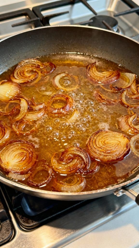 In a large sauté pan, melt 2 tablespoons butter with 1 tablespoon olive oil over medium heat. Add 3 thinly sliced onions, 1 teaspoon sugar, and ½ teaspoon salt. Stir often and cook for 15–20 minutes until soft and golden.
