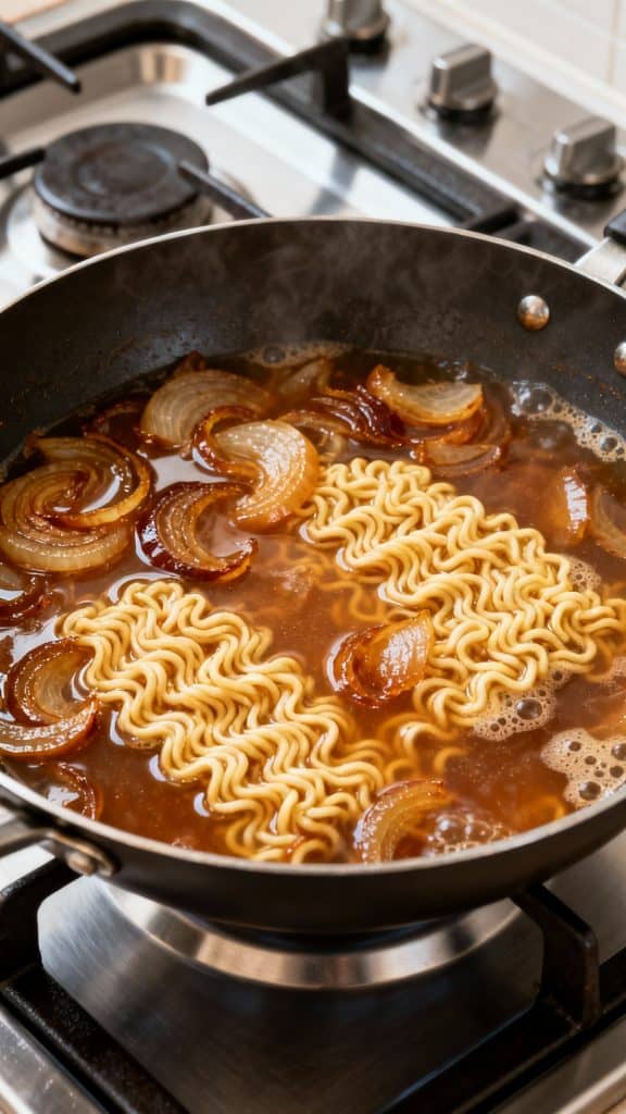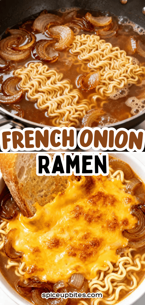 Caramelizing onions slowly breaks down their sugars, making them sweet and savory. Adding a touch of flour helps thicken the soup so the cheesy topping doesn’t sink. Ramen noodles soak up the flavor quickly, making it fast and satisfying.