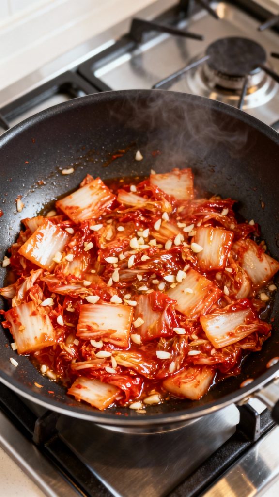 Heat 1 tsp neutral oil and 1 tsp sesame oil in a nonstick pan over medium heat. Add 1 clove minced garlic and ½ cup chopped kimchi. Stir-fry for 2–3 minutes until fragrant and sizzling.