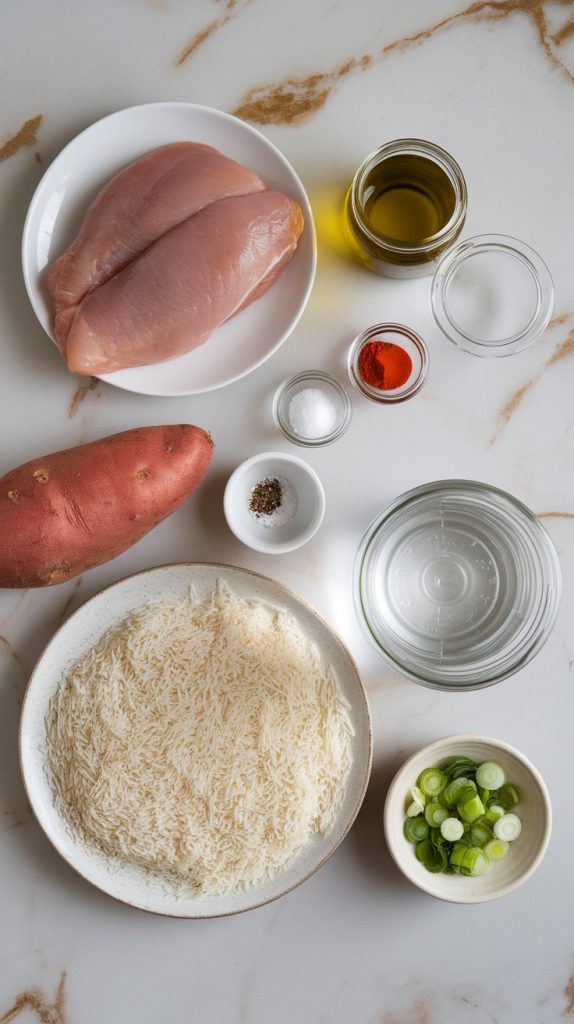 Roasting brings out the natural sugars in sweet potatoes while keeping their texture firm but soft. Cooking rice with the right water ratio gives it a fluffy base, and seasoning the chicken before roasting helps lock in flavor and moisture.