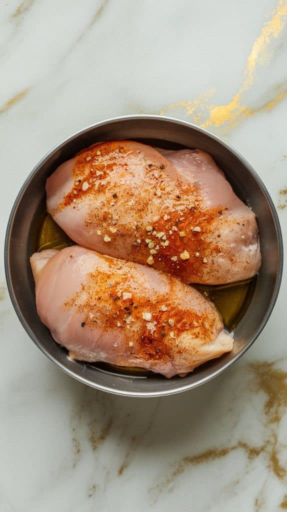 Place 2 chicken breasts in a bowl and rub with 1 tablespoon olive oil, ½ teaspoon salt, ¼ teaspoon black pepper, 1 teaspoon smoked paprika, and 1 teaspoon garlic powder. Mix until evenly coated.