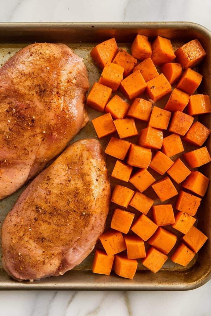 Place seasoned chicken and sweet potato cubes on a baking sheet, keeping them separated. Roast at 425°F for 25–30 minutes, flipping the chicken halfway, until chicken is cooked through and sweet potatoes are tender and caramelized.