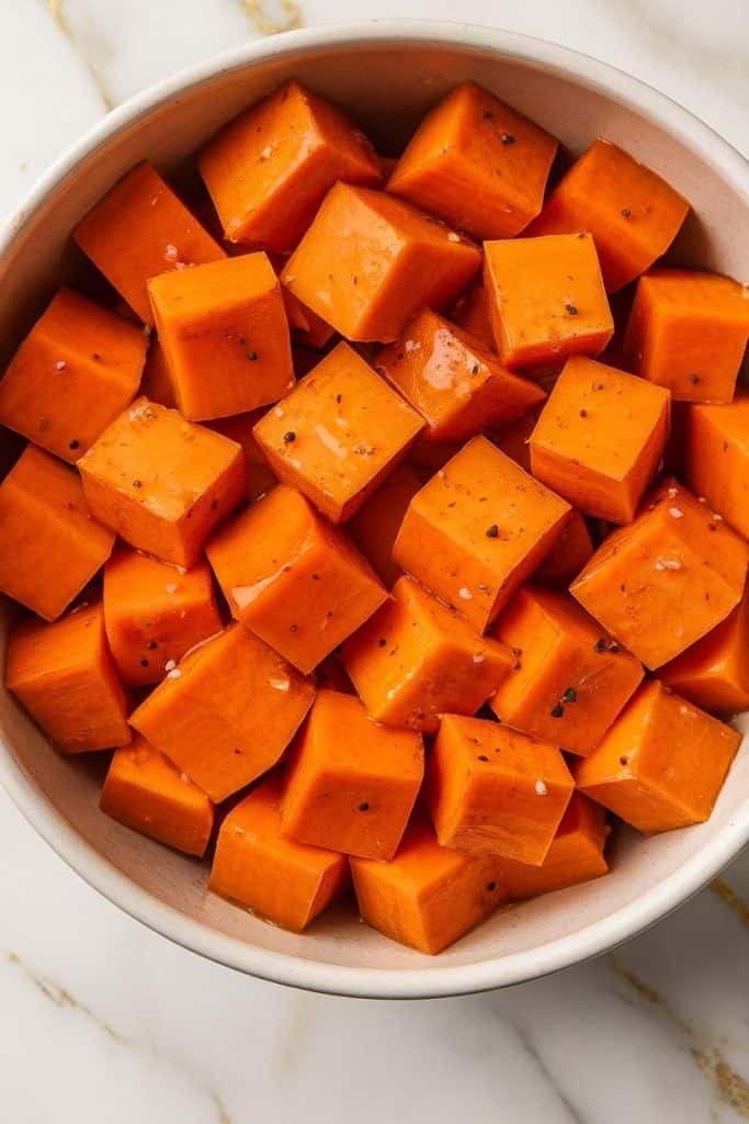 - Cube the sweet potatoes evenly so they roast at the same speed