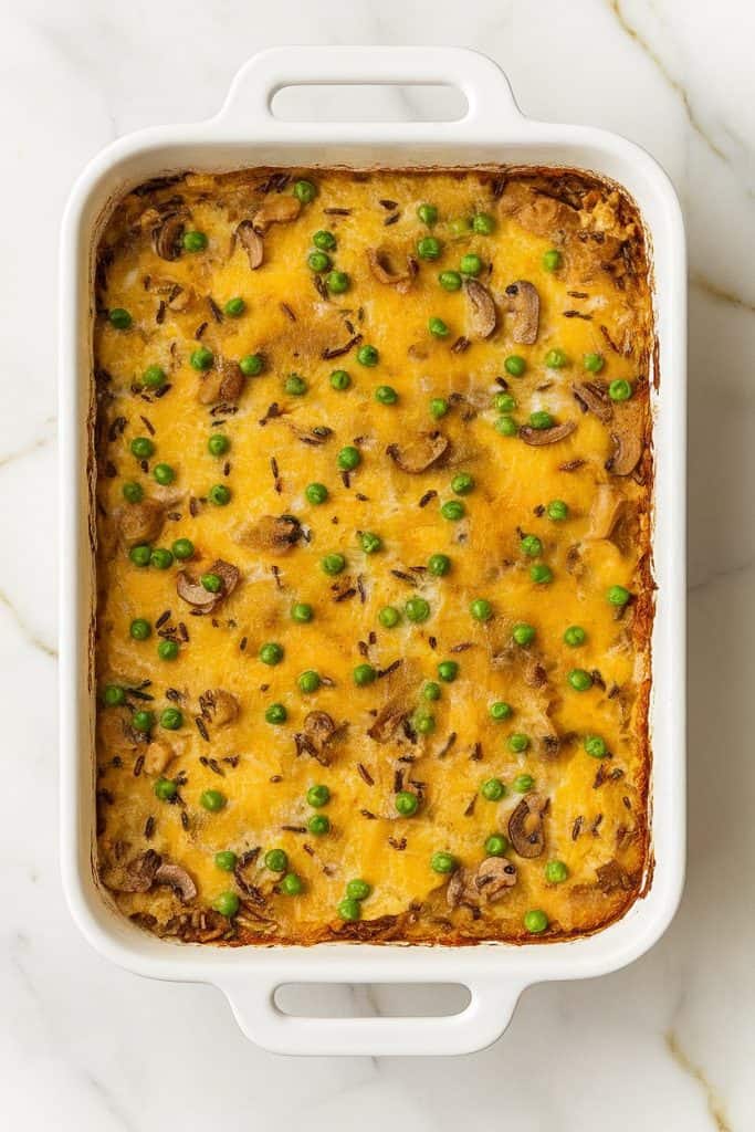 Wild rice keeps its texture even after baking, so the casserole doesn’t turn mushy. The sour cream and condensed soup mix create a creamy, stable base that holds up in the oven, and the cheese melts into every bite, bringing it all together.