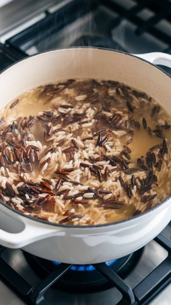 In a medium saucepan, add 1 cup uncooked wild rice blend and 2 ½ cups chicken broth. Bring to a boil, then cover and simmer for 40–45 minutes until rice is tender and broth is absorbed.