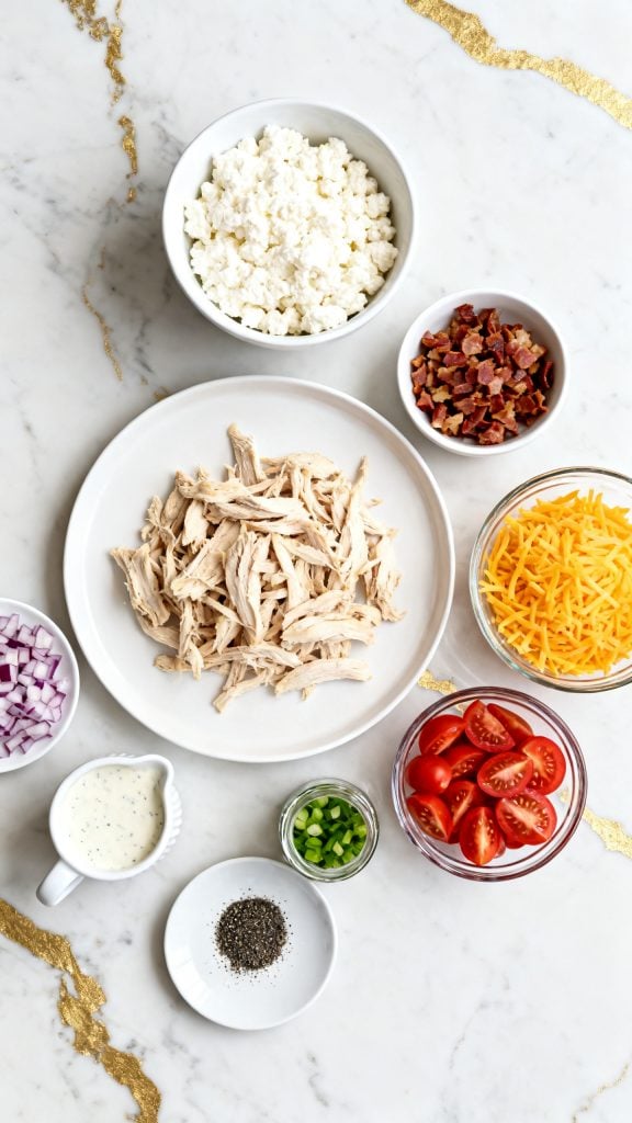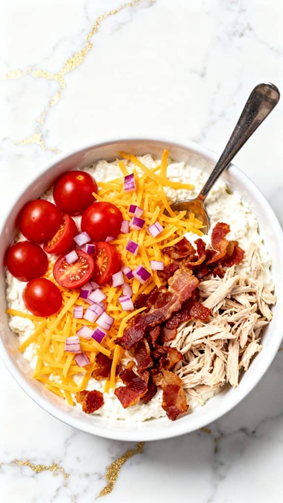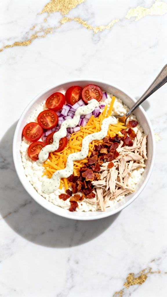 Cottage cheese is high in casein protein, which helps keep you full longer. The mix of fat (bacon, ranch, cheese) and protein (chicken, cottage cheese) balances blood sugar and gives you steady energy. Plus, the fresh veggies add crunch and contrast.