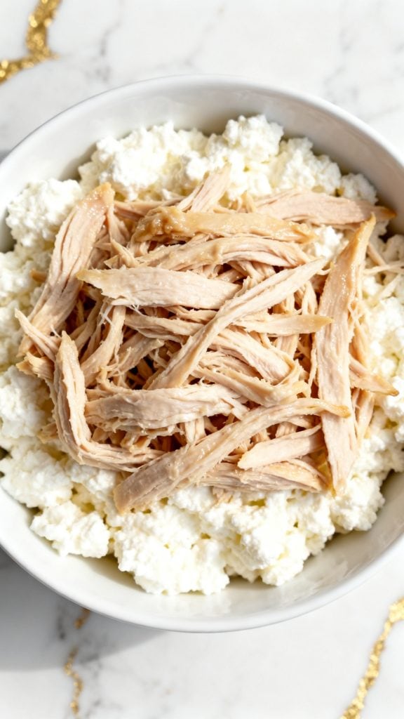 Top the cottage cheese with 1 cup shredded cooked chicken breast, spreading evenly across the top.
