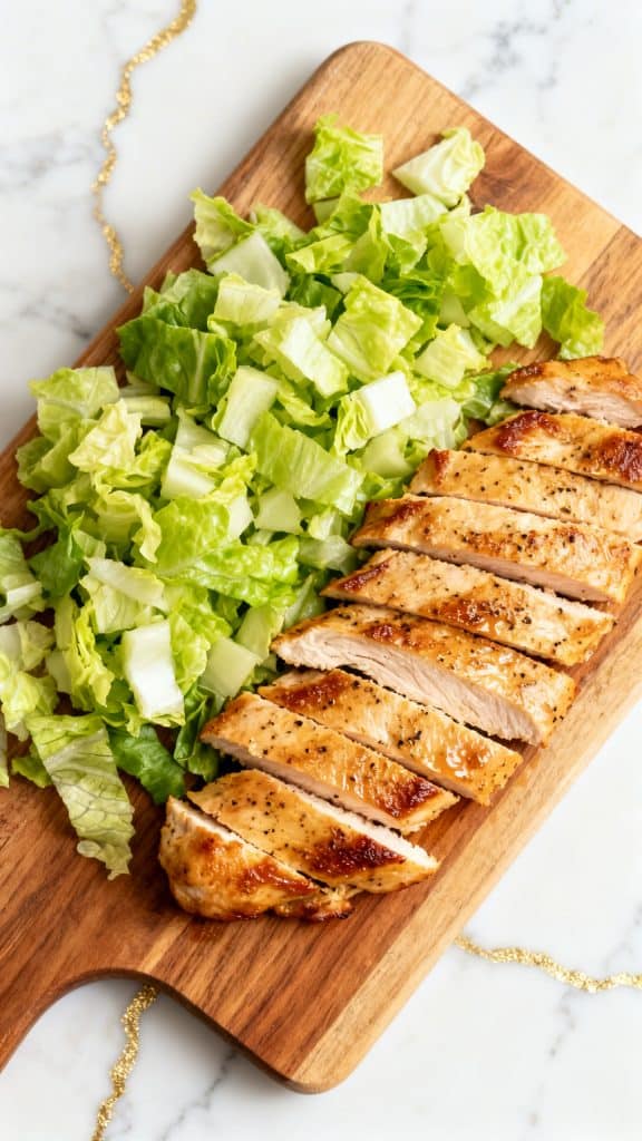 On a cutting board, chop 6 cups romaine lettuce into bite-sized pieces. Slice the rested, cooked chicken breasts into thin strips.