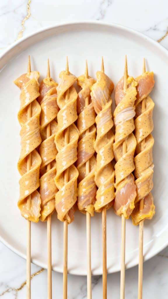 Thread the marinated chicken strips onto skewers, folding them back and forth in a ribbon pattern.