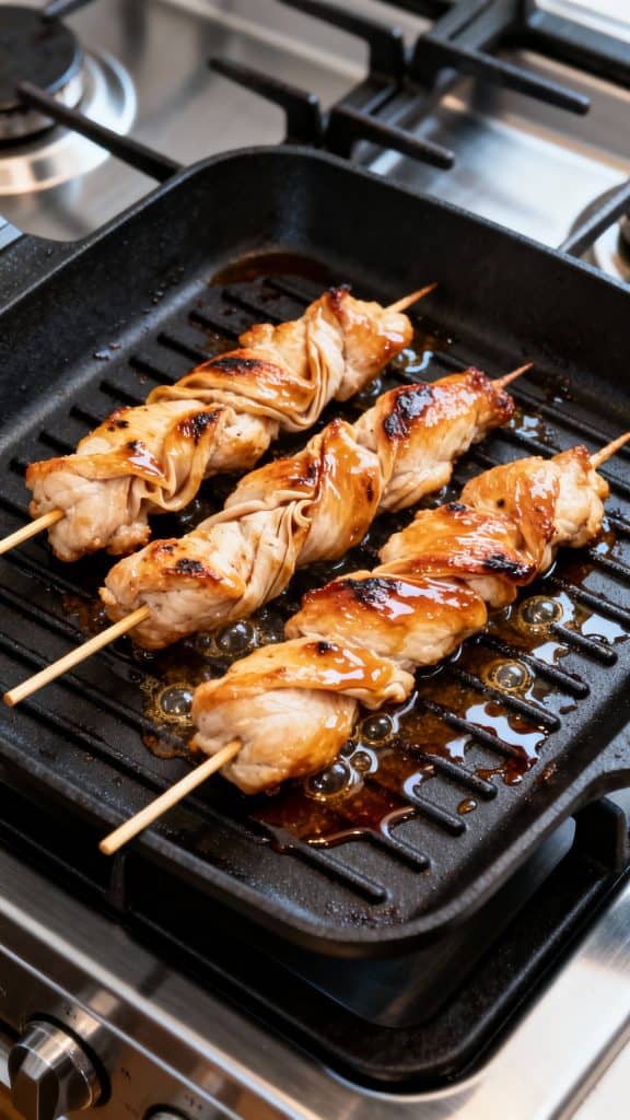 Heat a grill pan or skillet over medium heat. Cook the skewers for 3–4 minutes per side, until golden brown and cooked through (internal temp should hit 165°F).