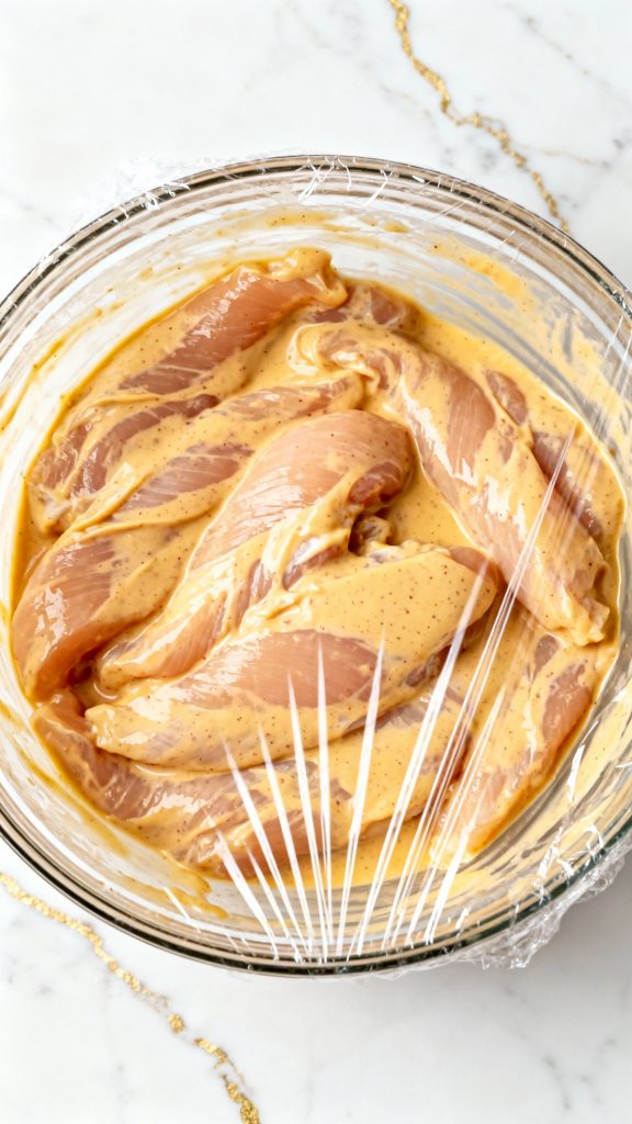 Add 1½ lbs chicken thigh strips to the marinade. Toss to coat. Cover and refrigerate for at least 1 hour (or overnight for deeper flavor).