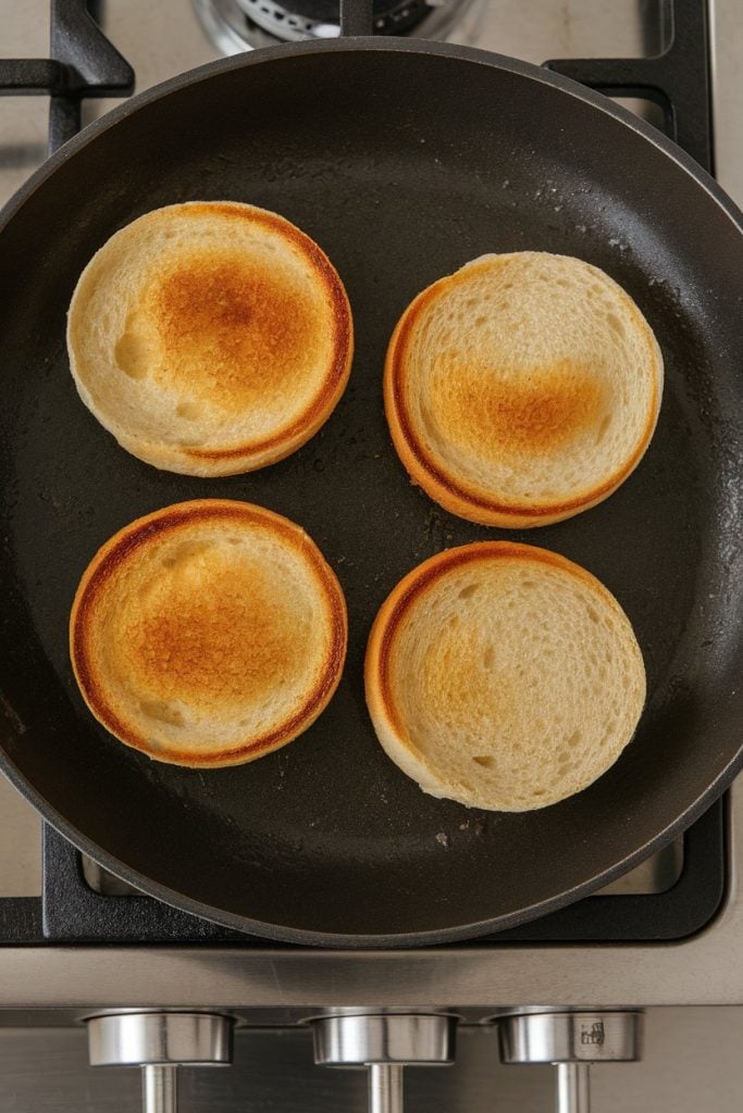 Slice and lightly toast 4 hamburger buns in a clean skillet or toaster until golden and crisp on the inside.