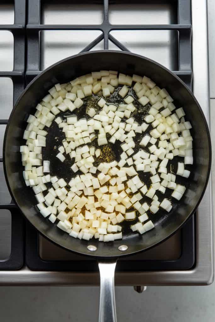 In a large skillet, heat 1 tablespoon olive oil over medium heat. Add ½ diced yellow onion and cook for 3–4 minutes, until soft and slightly golden.