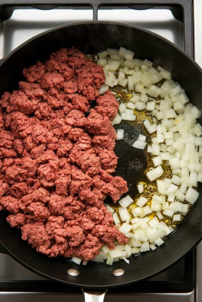 Add 1 lb ground beef to the skillet with the onions. Cook for 5–7 minutes, breaking it up with a spoon, until browned and no longer pink.