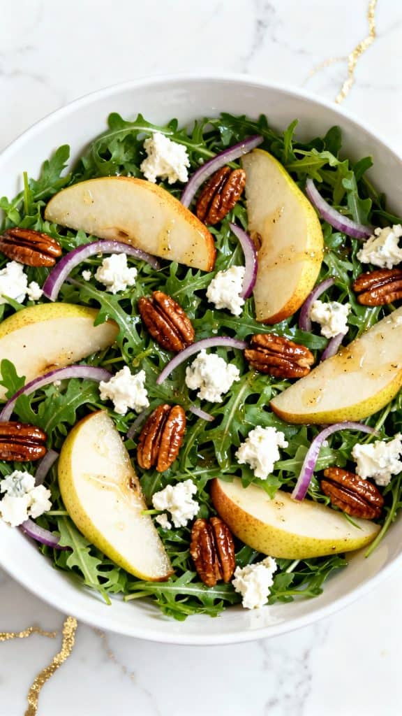 This Christmas arugula pear goat cheese salad is one of those dishes that makes everything else on the table feel fancier. It’s simple, fresh, and filled with flavor and texture. Give it a spot at your holiday table—you won’t regret it.