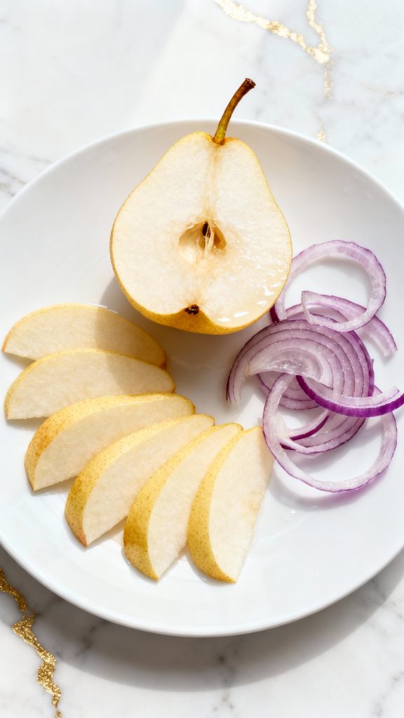 Thinly slice 1 ripe pear and ¼ red onion.