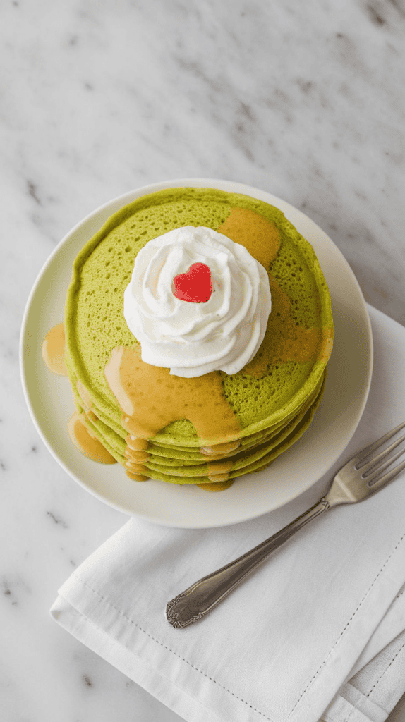 These bright green pancakes stack into little trees, making them fun to serve and decorate. They have a gentle matcha flavor that pairs well with syrup or fruit.