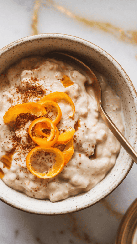 This recipe brings together orange zest, clove, and oats for a warm, citrusy breakfast with holiday spice. It’s not too sweet and has a gentle flavor that works well chilled or warmed up.