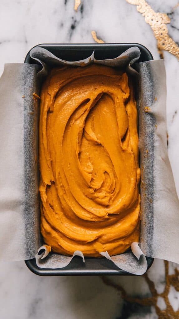Line a loaf pan with parchment paper. Pour in the batter and smooth the top.