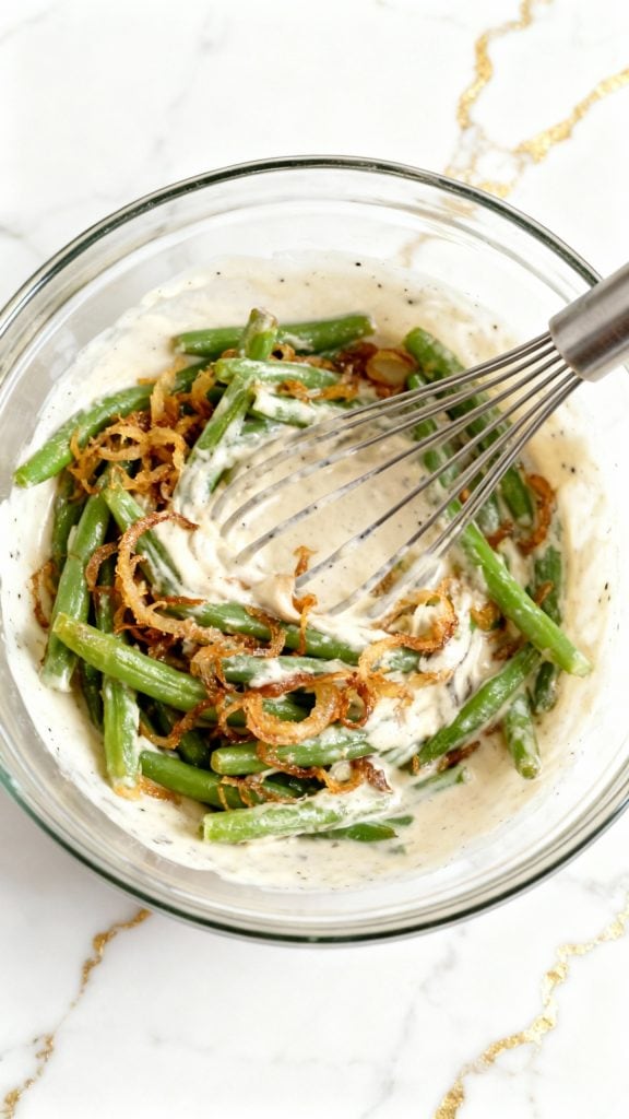 Add the blanched green beans and 2/3 cup of crispy fried onions to the sauce. Stir gently until everything is coated evenly.