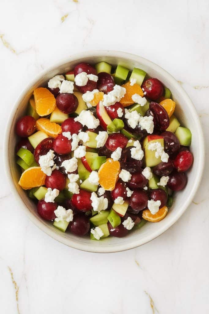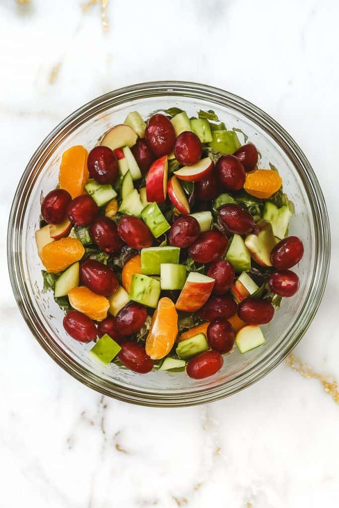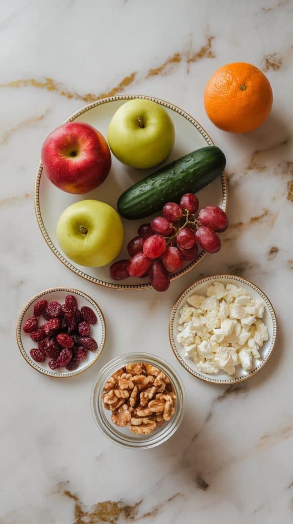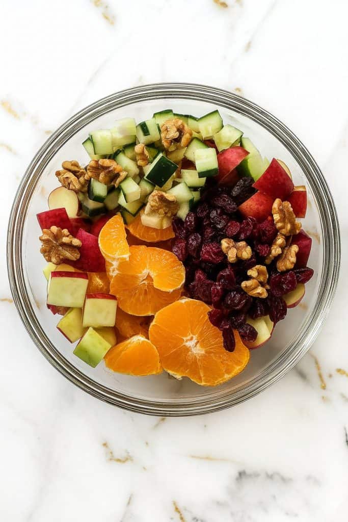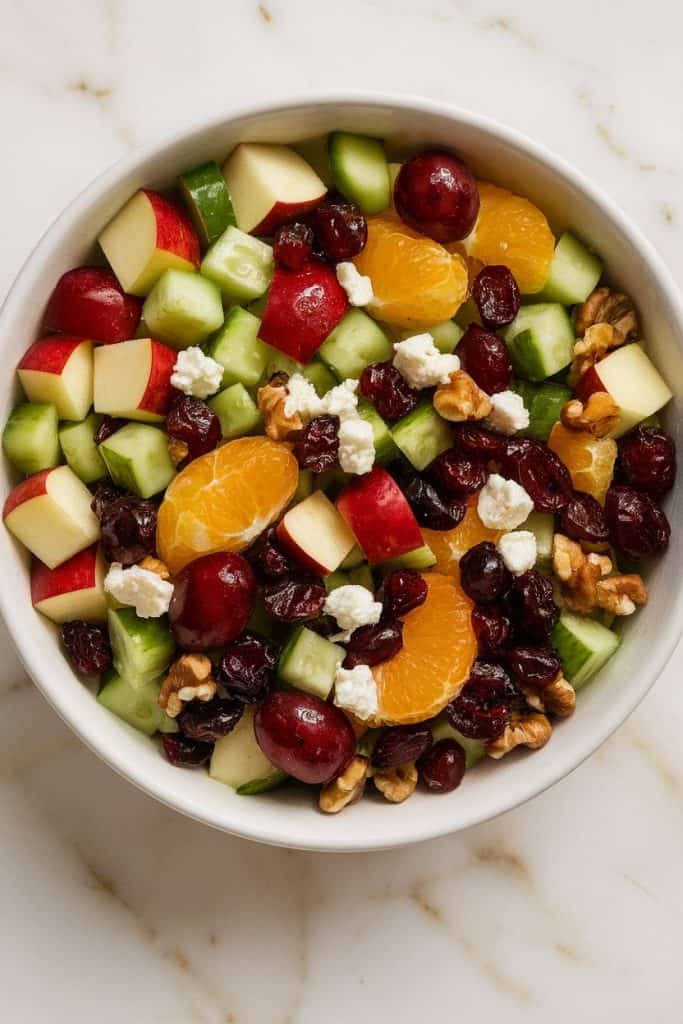 Crunchy fruits and veggies like apples and cucumbers hold up better than leafy greens. The acidity from the vinegar and orange juice keeps the apples from browning. Feta adds creaminess and salt, while cranberries and honey bring the sweet-tart contrast. Olive oil pulls it all together.
