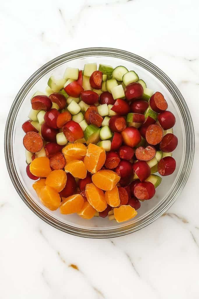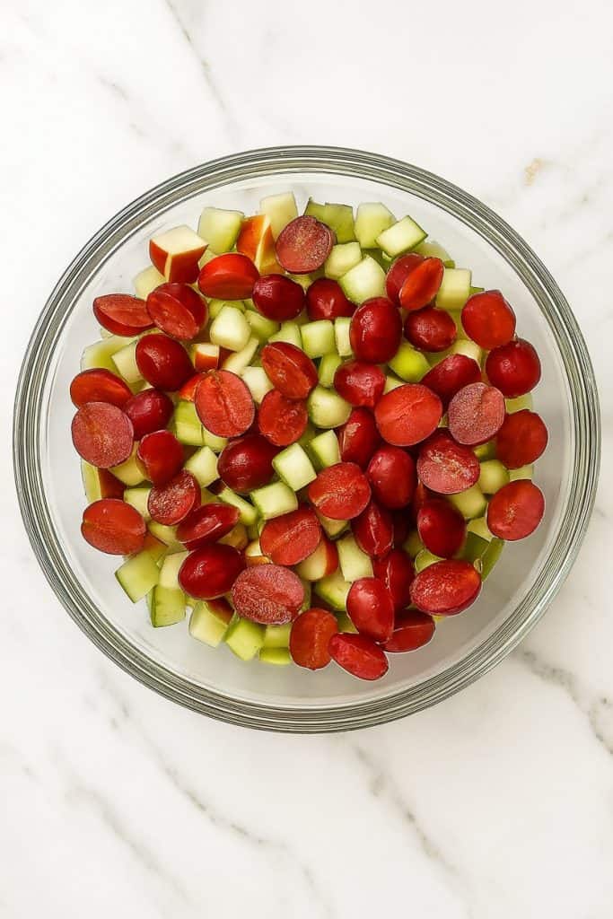 Dice 1 red apple and 1 green apple into small cubes. Place them into a large bowl.
