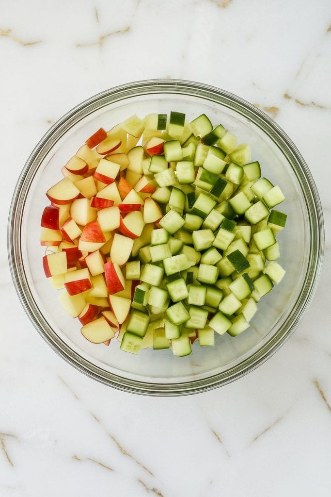 Chop 1 large cucumber into small bite-sized pieces and add it to the bowl with the apples.