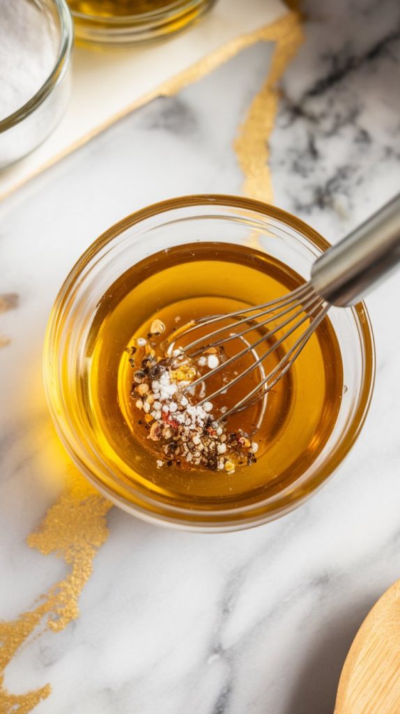 In a small bowl, whisk together 2 tbsp olive oil, 1 tbsp apple cider vinegar, 1 tsp honey, and a pinch of salt and pepper.