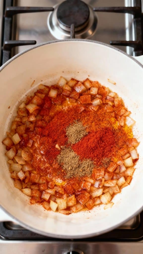 Add 1 teaspoon ground cumin, 1 teaspoon chili powder, and ¼ teaspoon smoked paprika. Stir to coat the onion and garlic, cooking for 30 seconds to bring out the flavors.