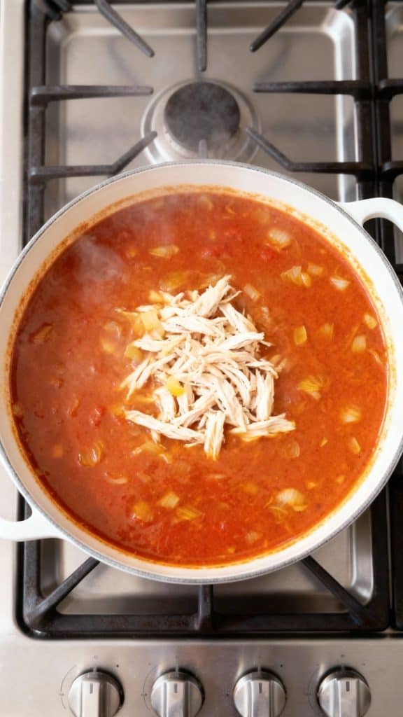 Add 1½ cups shredded cooked chicken to the pot. Stir and simmer for 5 more minutes so the chicken heats through and absorbs flavor.
