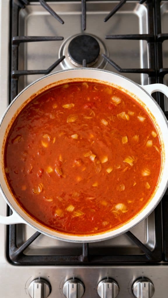 Pour the masa-broth mixture into the pot, then add the remaining 2 cups chicken broth and 1 can of enchilada sauce. Stir well and bring to a simmer. Let cook for 10 minutes, stirring occasionally.