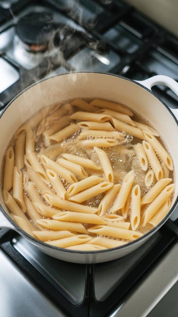 Cook 12 oz penne pasta in a large pot of salted boiling water until just al dente. Drain and set aside.