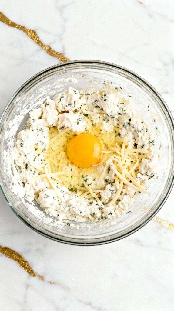 In a large bowl, mix 1½ cups full-fat cottage cheese, 1 cup shredded mozzarella, ½ cup grated parmesan, 1 large egg, 1 teaspoon dried oregano, ½ teaspoon salt, and ¼ teaspoon black pepper. Stir well until combined.