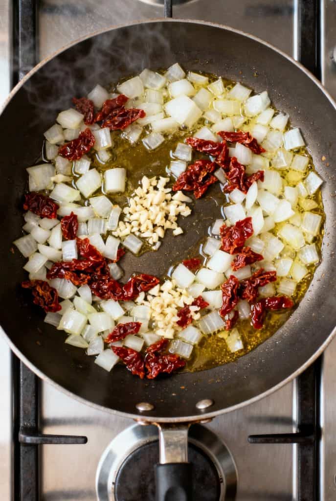 In a medium skillet, heat 1 tablespoon olive oil over medium heat. Add 1 diced white onion and cook for 3-4 minutes until softened. Add 3 minced garlic cloves and sauté 30 seconds more. Add 1 cup chopped sun-dried tomatoes (drained) and stir to combine. Remove from heat.
