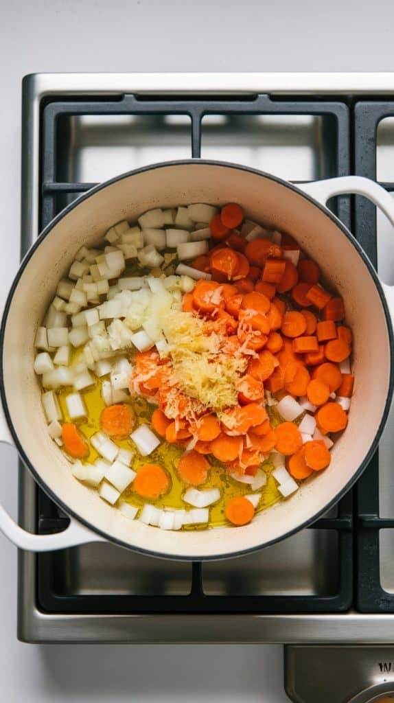 Heat 1 tablespoon olive oil in a medium pot over medium heat. Add 1 small diced yellow onion and cook for 3–4 minutes until softened. Add 2 cups chopped carrots and 1 tablespoon grated fresh ginger. Cook for 5 minutes, stirring often.