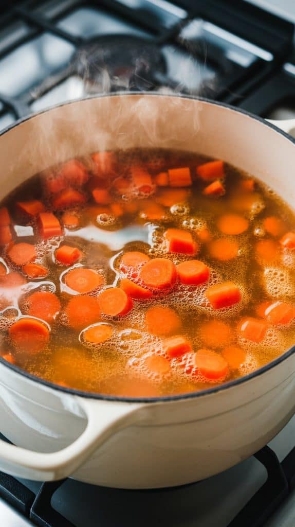 Pour in 2 cups vegetable broth and 1 cup water. Stir in ½ teaspoon salt and ¼ teaspoon black pepper. Bring to a boil, then reduce heat and simmer for 12–15 minutes, until the carrots are very soft.