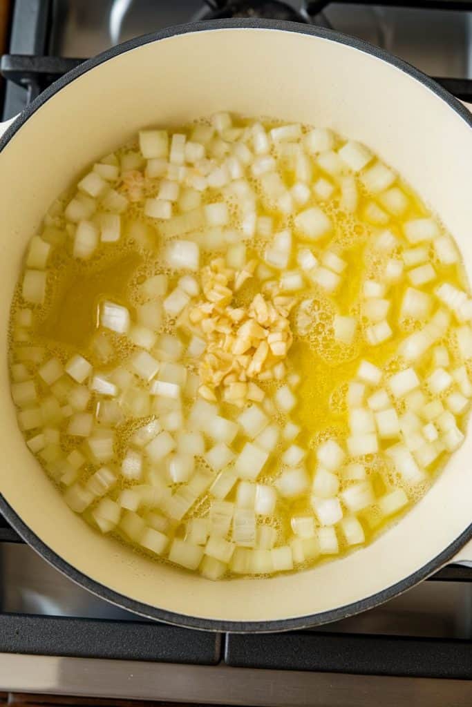 In a large pot over medium heat, add 1 tablespoon olive oil and 1 tablespoon unsalted butter. Once melted, add 1 small diced yellow onion and cook for 4–5 minutes until soft. Add 2 cloves minced garlic and cook for 1 minute more.