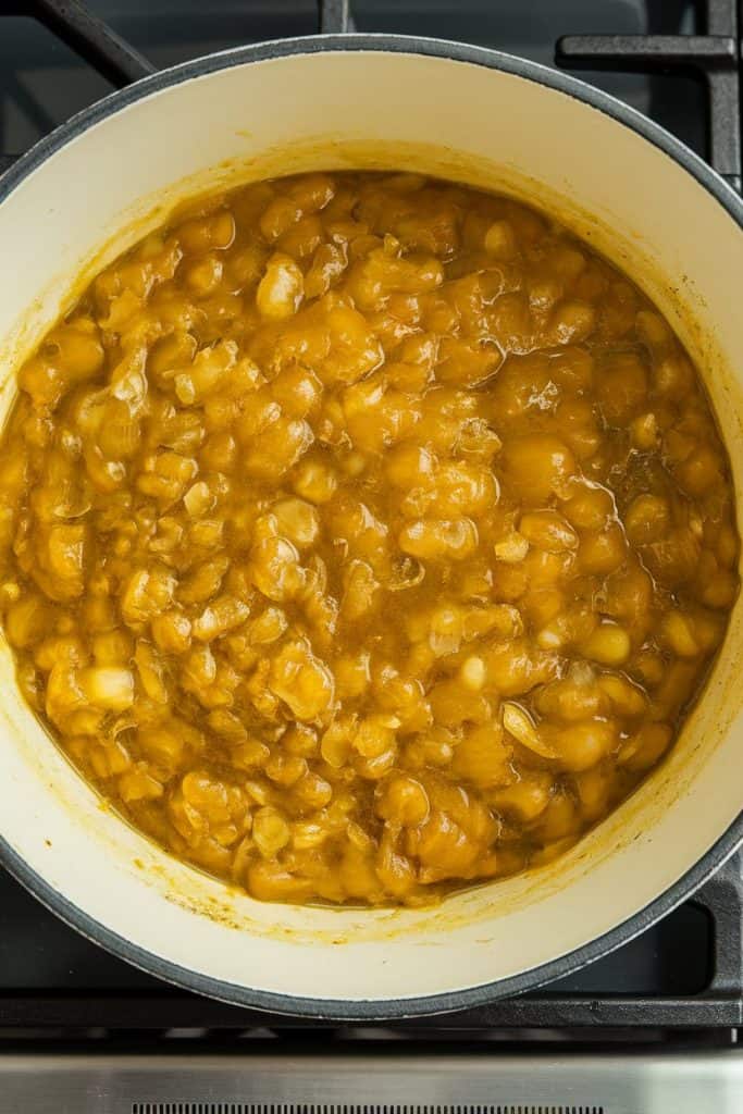 Sprinkle in 1 tablespoon curry powder, ½ teaspoon ground turmeric, and ¼ teaspoon ground cumin. Stir constantly for 1 minute to toast the spices and coat the onions.