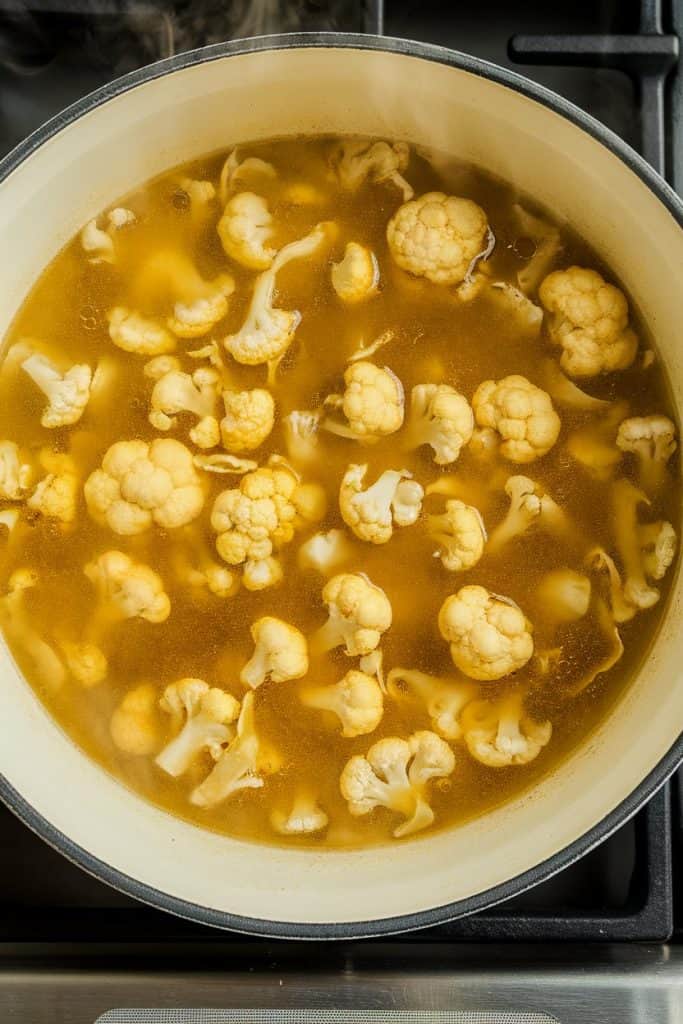 Add 4 cups cauliflower florets to the pot, then pour in 3 cups vegetable broth. Add ½ teaspoon salt and ¼ teaspoon black pepper. Stir and bring to a gentle simmer. Cover and cook for 15–18 minutes until the cauliflower is fork tender.