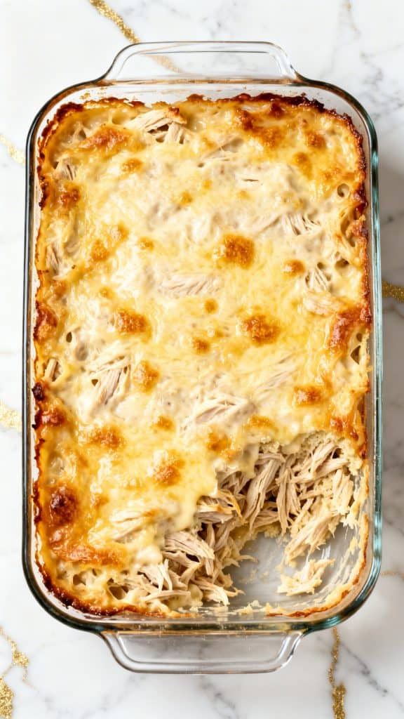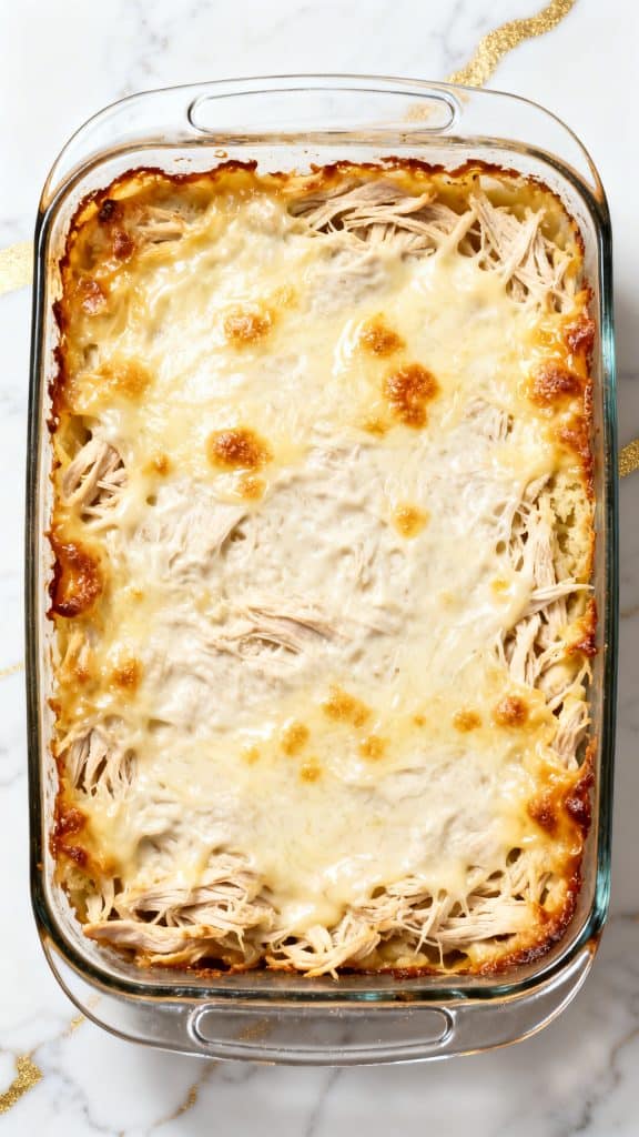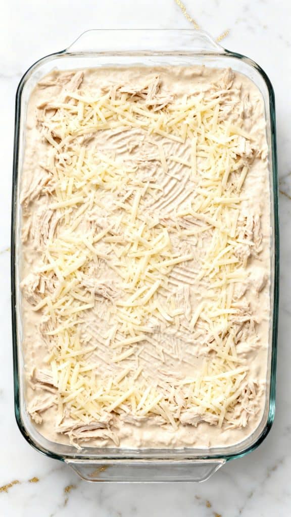 Spread the chicken mixture evenly into the baking dish. Sprinkle 1 cup shredded mozzarella cheese on top.