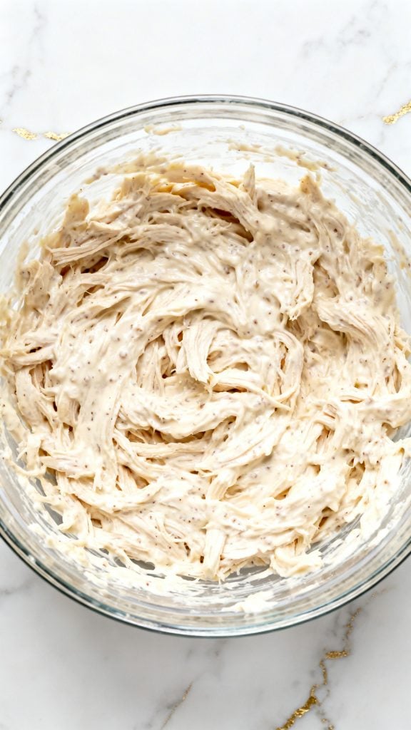 Add 2 ½ cups shredded chicken to the bowl and mix until fully coated.