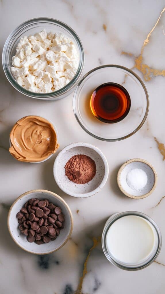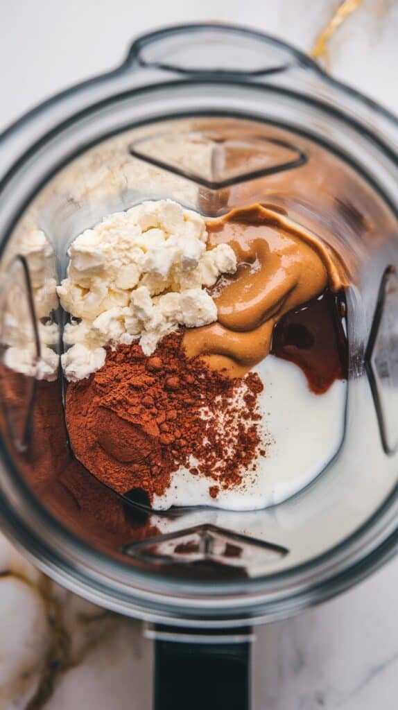 Add 1 cup cottage cheese, 2 tablespoons natural peanut butter, 1 tablespoon maple syrup, 2 tablespoons cocoa powder, and 1 teaspoon vanilla extract to a high-speed blender or food processor. Blend until completely smooth and creamy. If it’s too thick, add 1–2 tablespoons of milk and blend again.