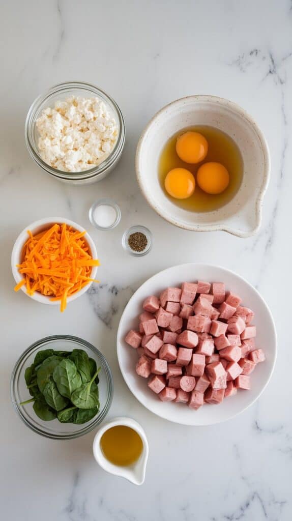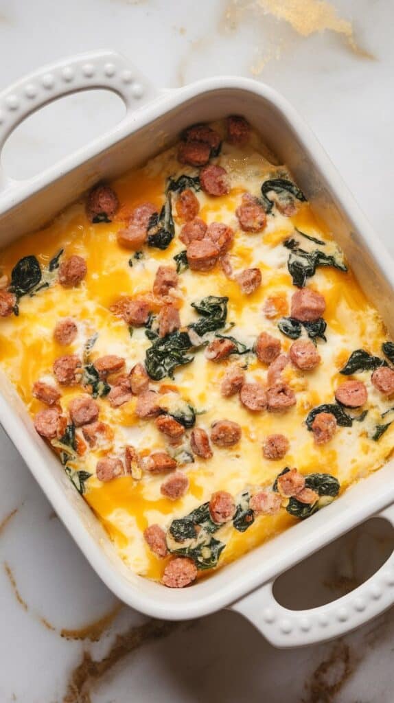 Cottage cheese brings moisture and protein, and when baked with eggs, it creates a fluffy, creamy texture without needing cream. The proteins in the eggs set during baking, forming a soft, sliceable structure. Chicken sausage adds flavor and fat, while cheese brings everything together with richness and a melty finish.